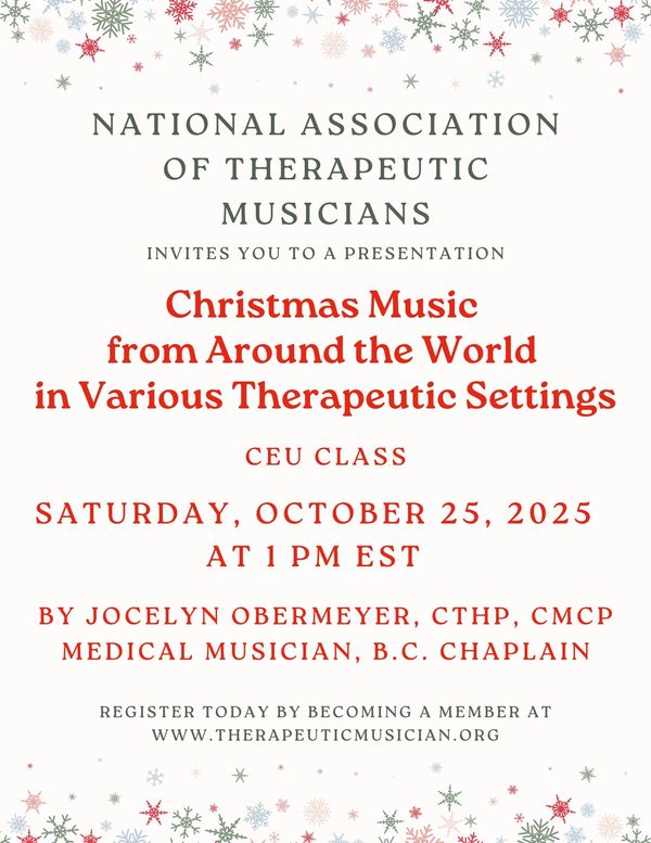 Mission: The National Association of Therapeutic Musicians supports, promotes, and elevates the practice of therapeutic musicians and sound healers to foster a sustainable practice in healthcare settings and other spaces of healing.